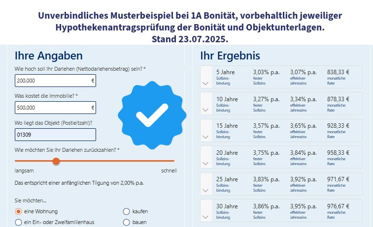 Ergänzend ODER UNABHÄNGIG von einem Immobilienkauf oder -Verkauf über uns prüfen wir soweit von Ihnen gewünscht und beauftragt, mit KI gestützter Onlinevergleichssoftware, bei über 500 Banken, was für Immobilienfinanzierungen für Sie persönlich, aktuell, zu welchen Konditionen, bei welcher Bank machbar sind und welche nicht.